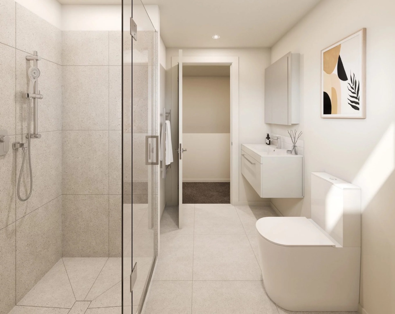 Upstairs you will find two good sized bedrooms. All bathrooms feature a tiled, frameless glass shower and a space-saving floating vanity. Each townhouse also includes an off-streetcar park for added ease.