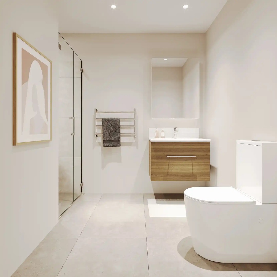 The ground floor offers an open-plan living, dining, and kitchen layout fitted out with a Samsung heat pump. The ground floor also provides ample storage with a storage cupboard under the stairs. Upstairs, you will find two bedrooms, with built-in wardrobes and the main bathroom. The bathroom is completed with tiled flooring, a frameless glass shower, and a floating vanity.
