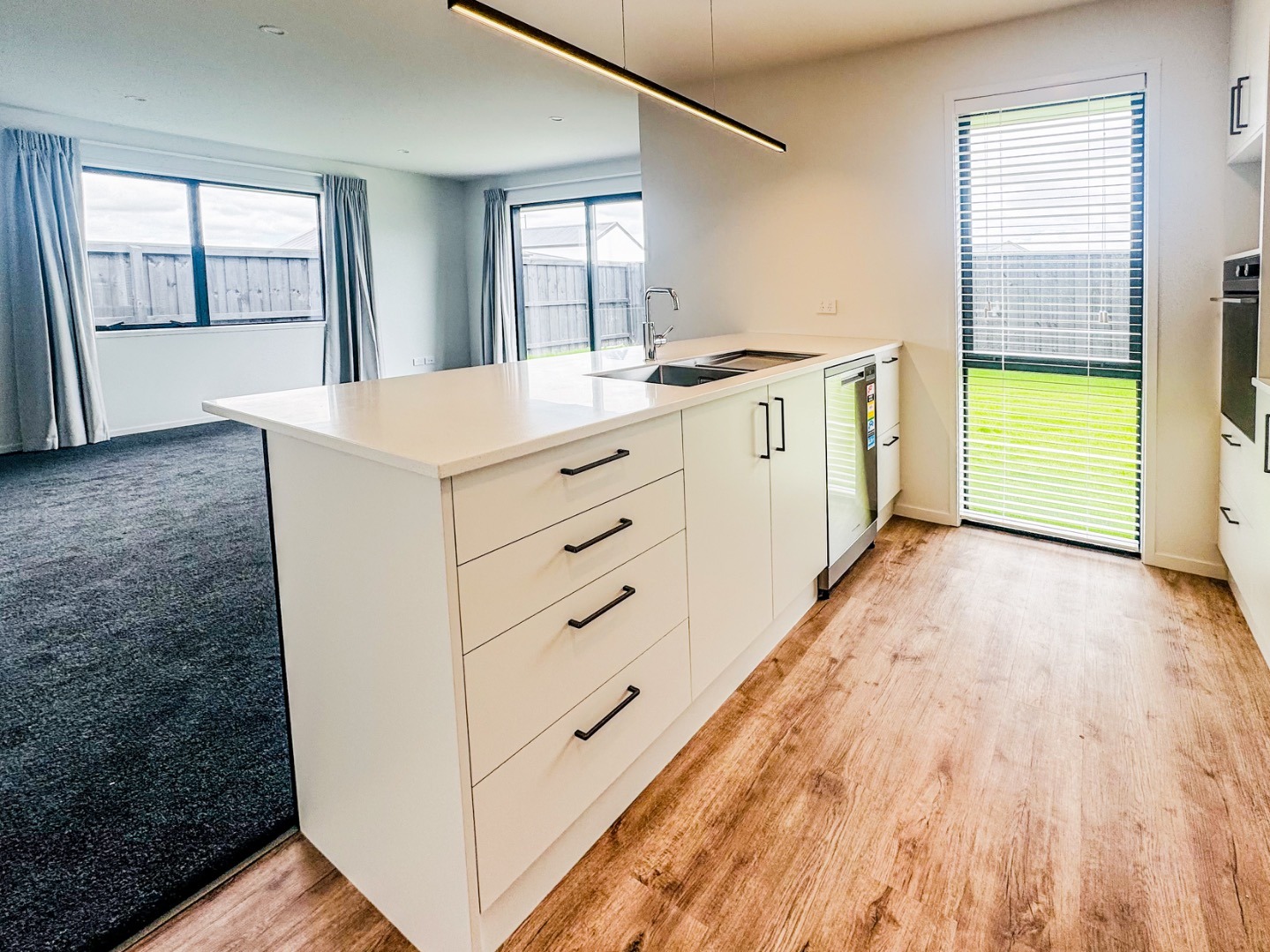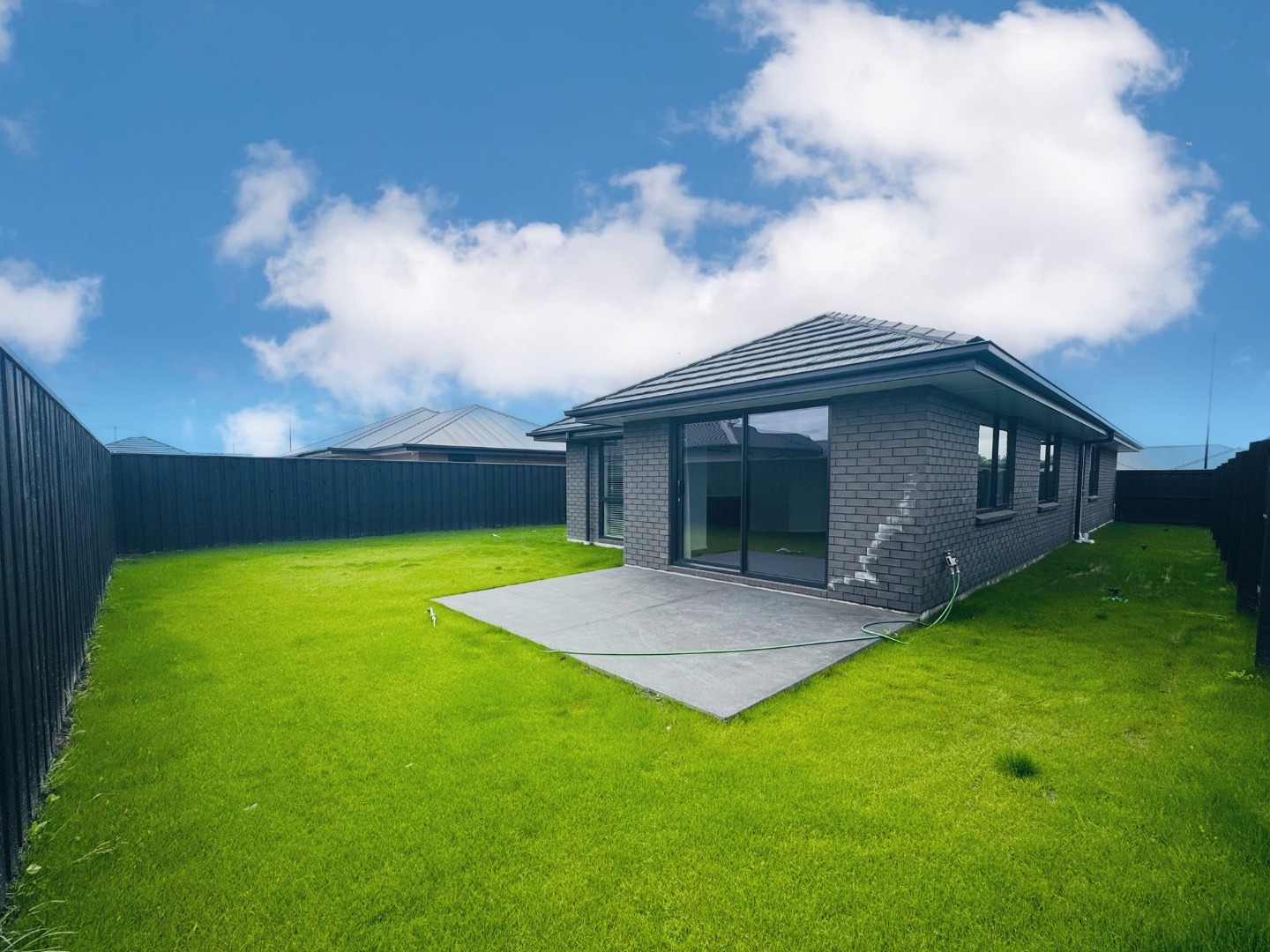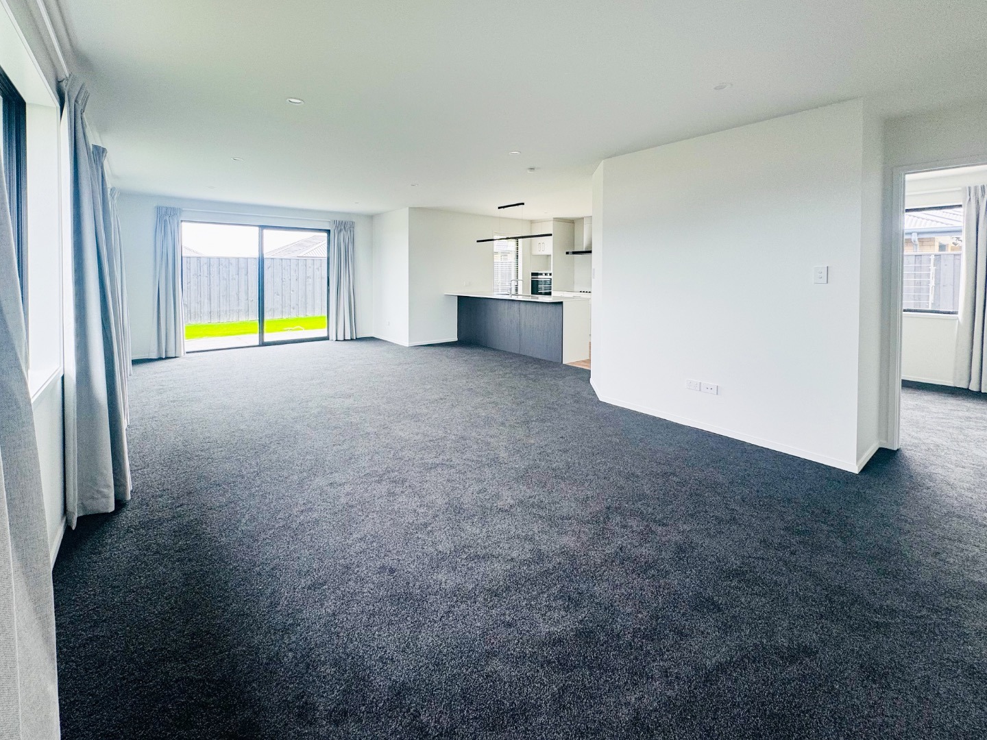 • Open plan kitchen and living area leading to a private, fully fenced family-sized section, featuring a concrete patio and lush green lawns.