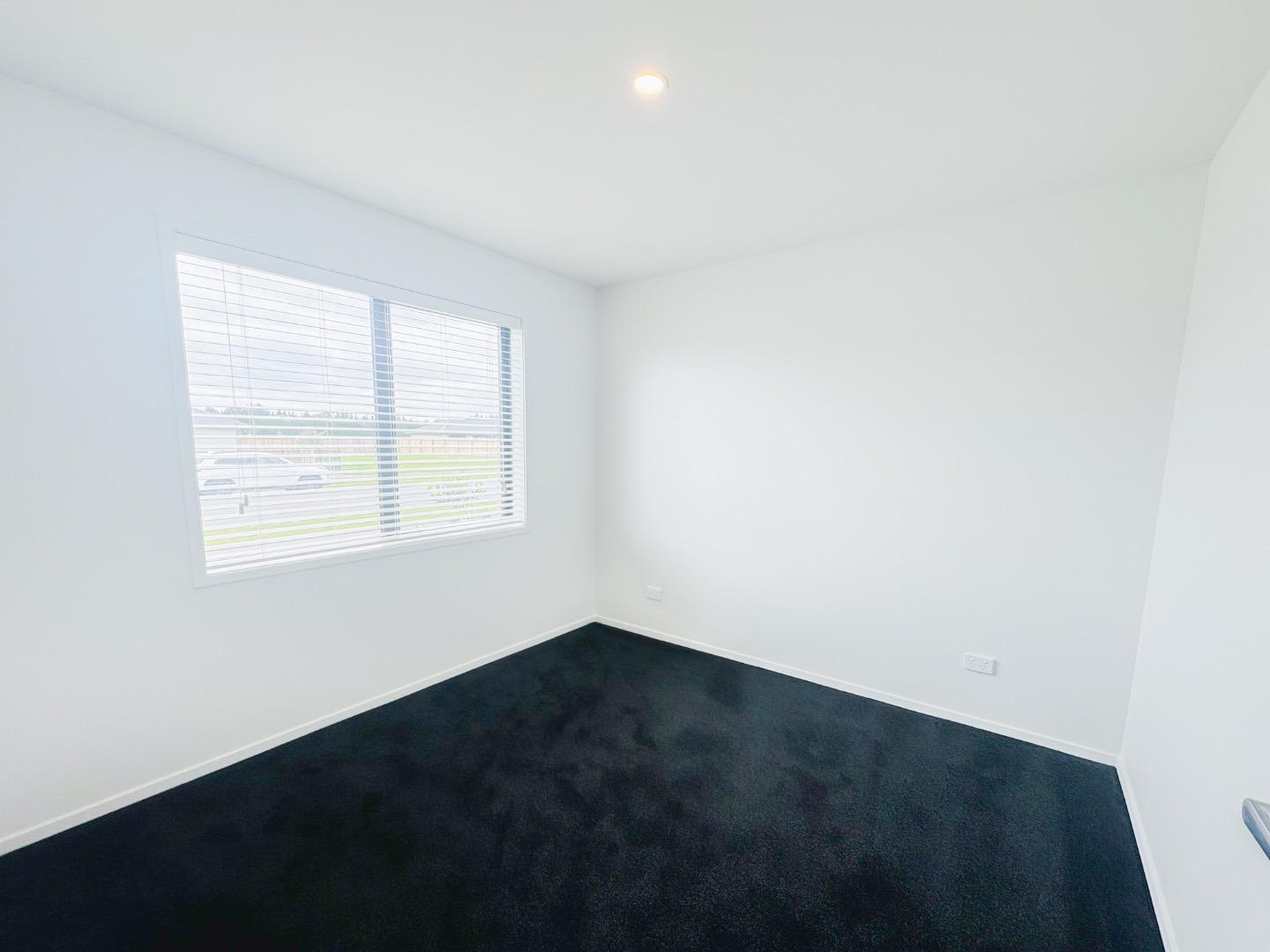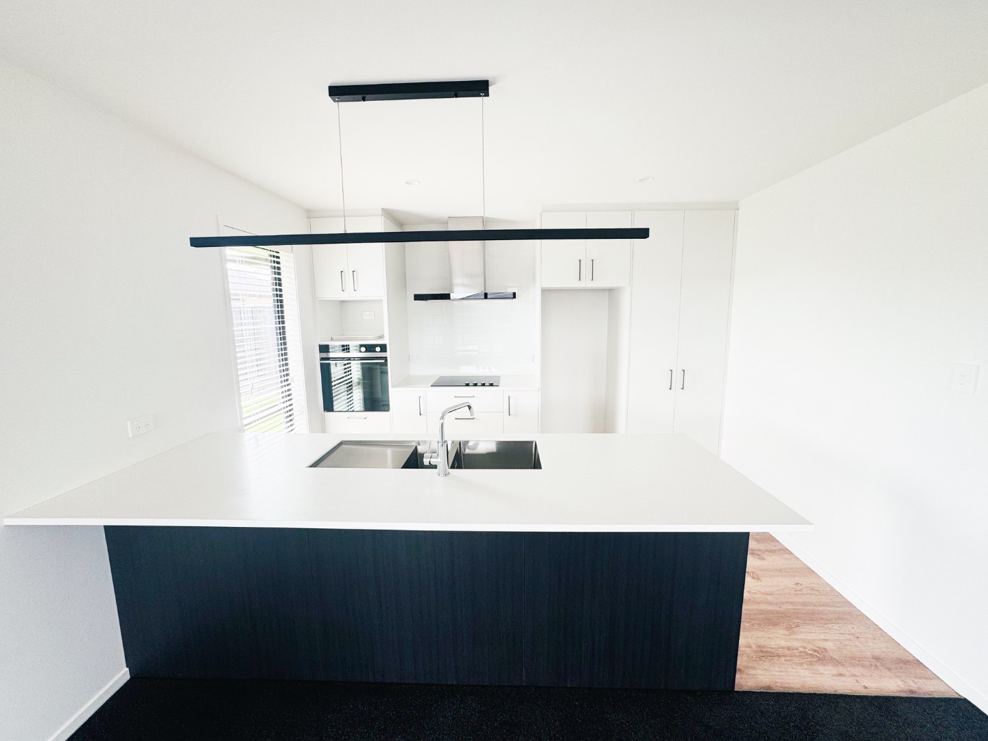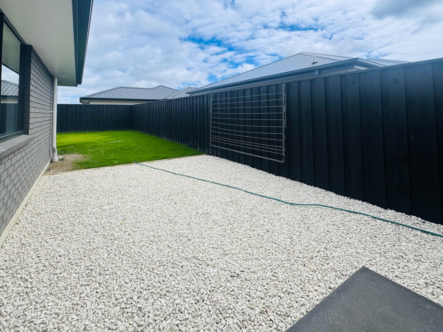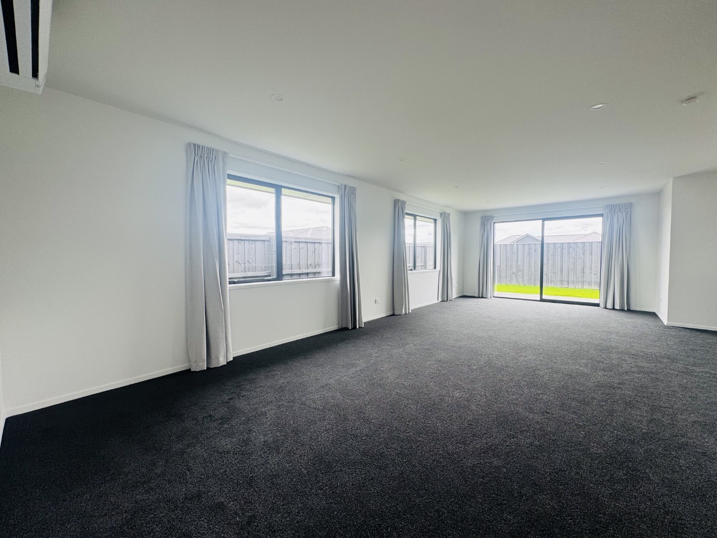 • Open plan kitchen and living area leading to a private, fully fenced family-sized section, featuring a concrete patio and lush green lawns.