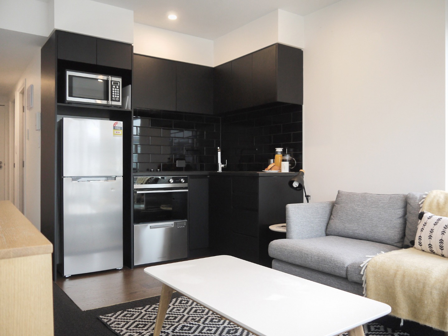 As you enter, you have the double bedroom to the left of the corridor, and walk straight down to the open plan layout that includes your lounge, dining area and kitchen. Your laundry is neatly tucked away in a closet next to the bathroom.