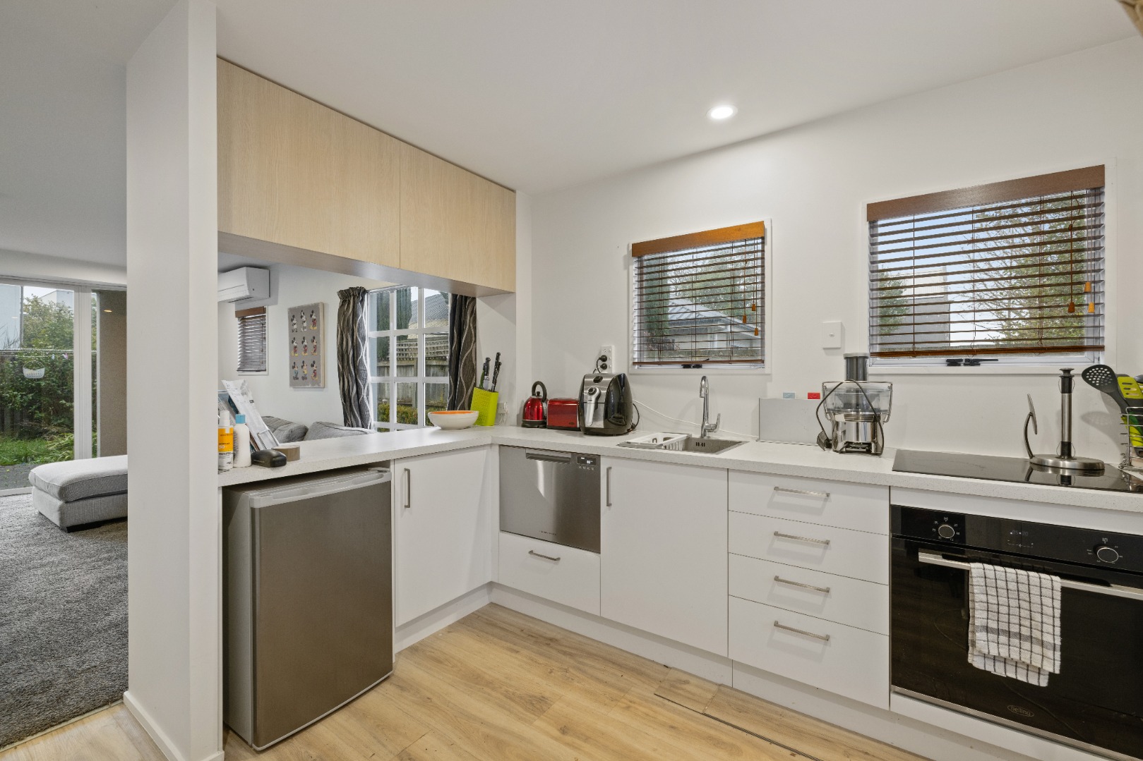 Open plan kitchen including bar fridge, living area leading to a private, secure courtyard