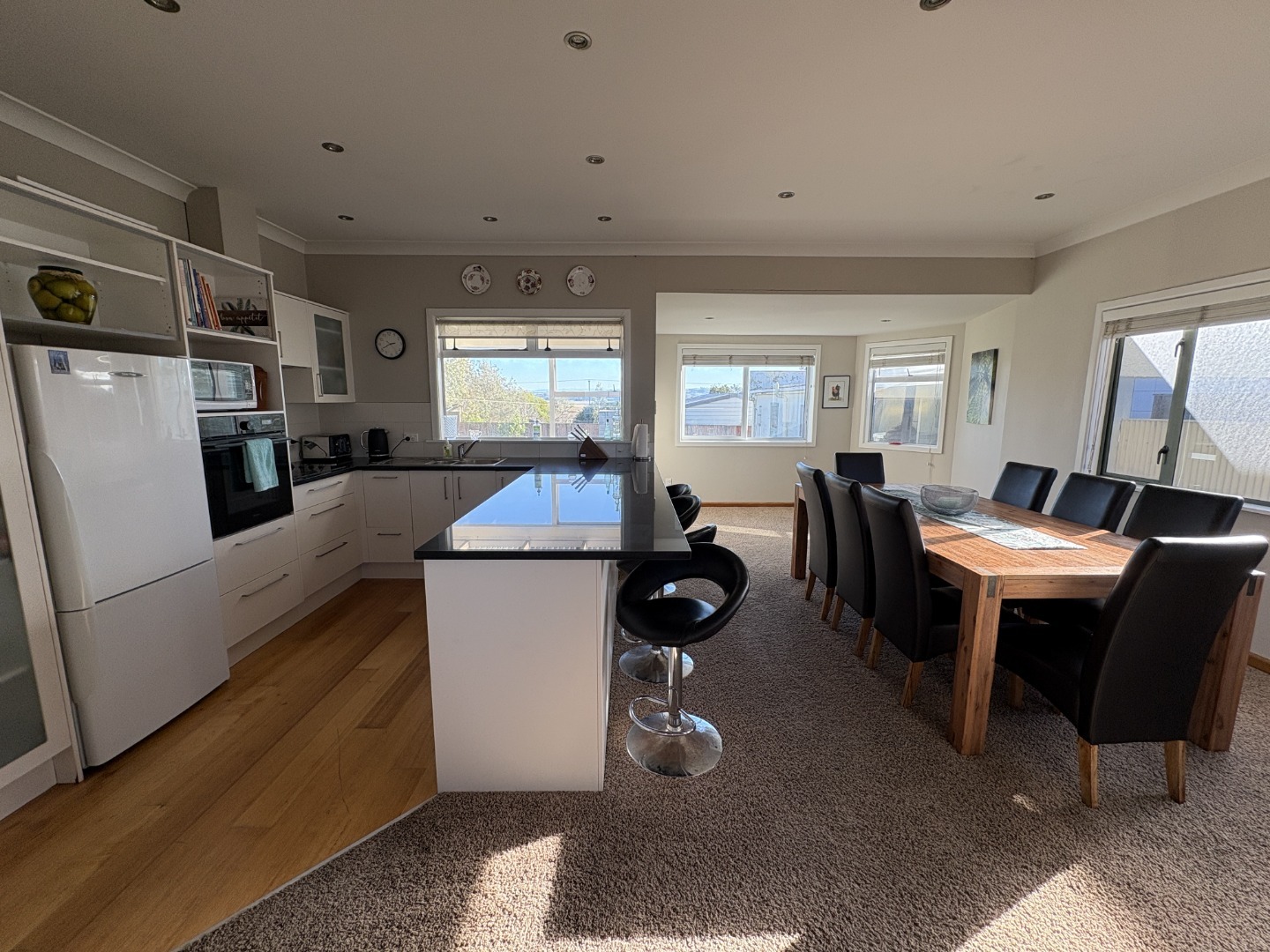 The modern kitchen is equipped with an in-wall oven, dishwasher, and breakfast bar, perfect for preparing meals. There is also a separate dining area for family meals.
