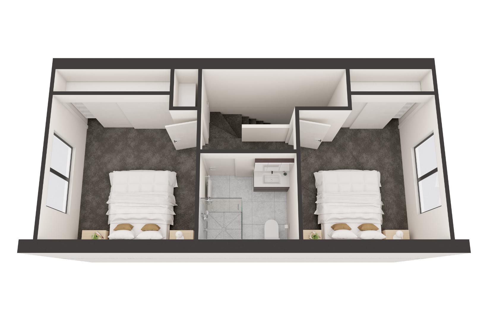 In these two-bedroom townhouses, bedrooms and the main bathroom are located on the second level of the home, and an additional toilet is located on the ground floor for visiting guests. Each bedroom has an in-built wardrobe and additional storage options within each townhouse.