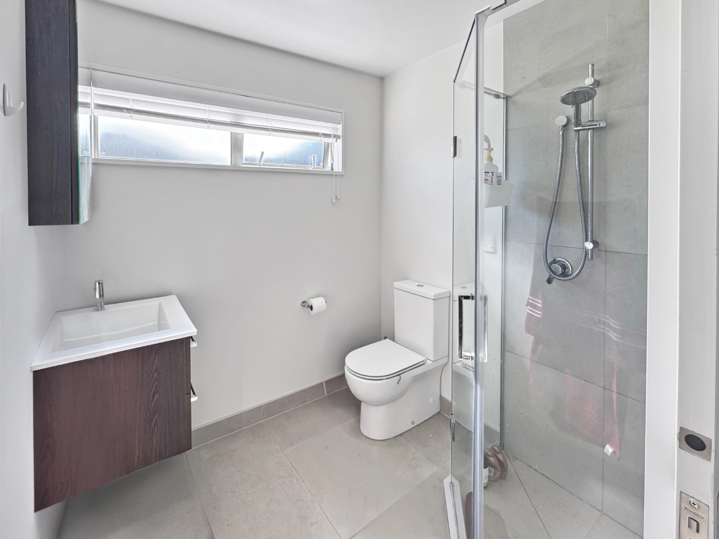 • Modern bathroom featuring a tiled shower and wall-hung mirror cabinet