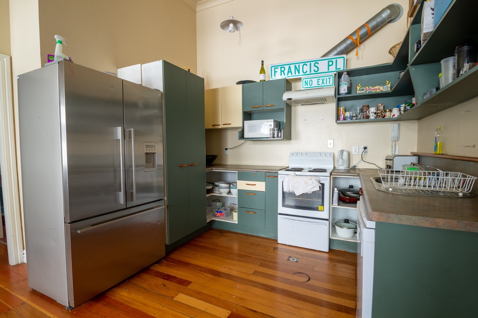 While the apartment offers plenty of room to spread out, it’s not brand new. The decor and joinery are older, but the essentials are all there. It comes fully stocked with whiteware, including a dishwasher, fridge freezer, washing machine and clothes drier.