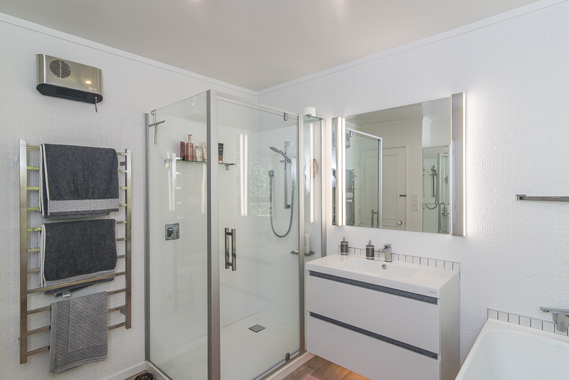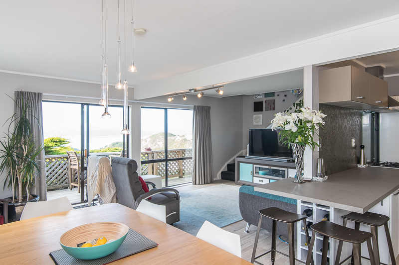 Downstairs is another double bedroom, bathroom and open plan kitchen/lounge with a heat pump to keep you warm and cosy this coming winter. Outside is a low maintenance deck front and back and off street parking and garage.